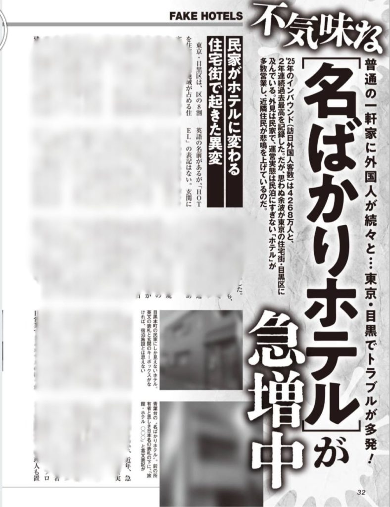 しかし、その後2026年2月17日には雑誌『SPA!』紙面でも「名ばかりホテル」が急増中。という記事が出され、この記事はヤフーニュースでも取り上げられました。住宅街目黒区に外見は民家で、運営実態は民泊にすぎない「ホテル」が多数営業している現状が伝えられています。